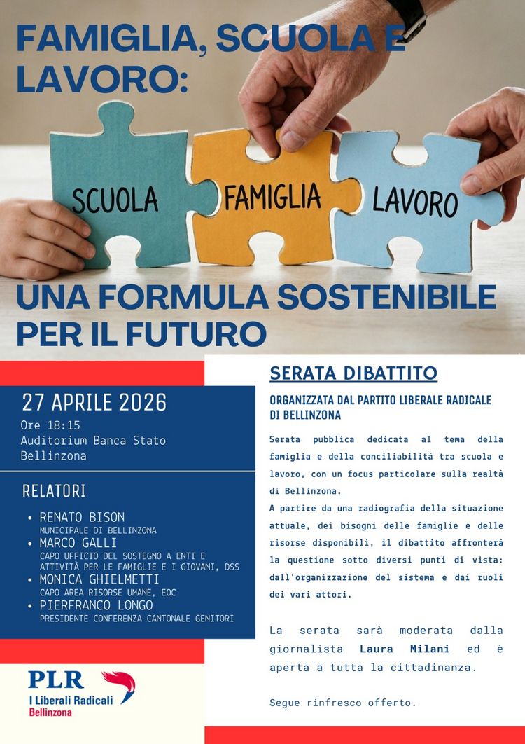 Il PLR Bellinzona invita a una serata di discussione aperta sul tema della conciliabilità tra scuola, famiglia e lavoro, con uno sguardo alle sfide e alle esigenze del nostro territorio.