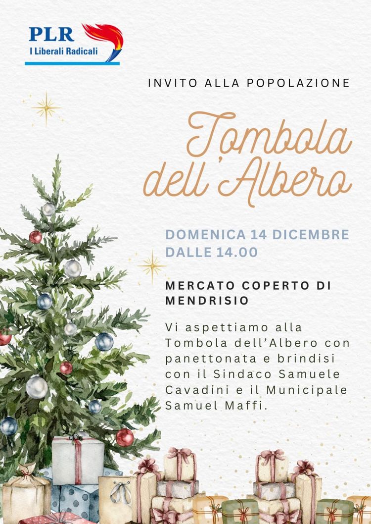 anche quest’anno il PLR di Mendrisio è lieto di invitarvi alla tradizionale Tombola dell'Albero, che si terrà domenica 14 dicembre 2025dalle ore 14.00 presso il Mercato coperto di Mendrisio